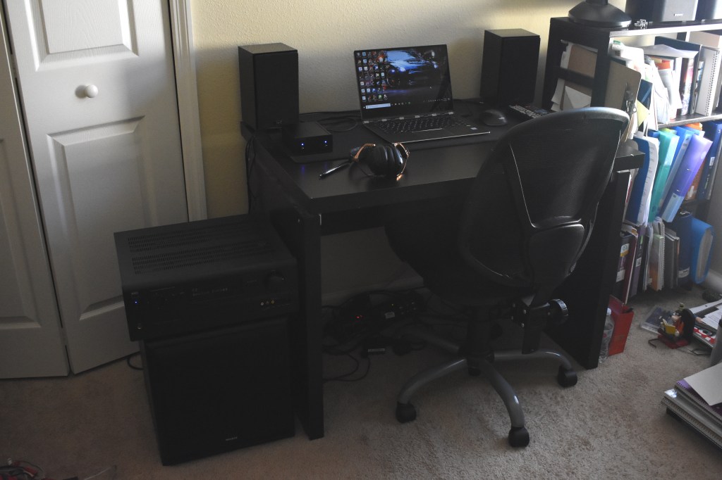 As you can see, a few changes have been made to my whole desk set-up. Do forgive me for the messy bookshelf on the side. So, to elaborate, I happened to have gotten speakers stands weeks ago because I wanted to use my Sony SS-K10ED bookshelf speakers in the gaming room downstairs where I have a system as well. The speakers used there ended up being something else, but that means that I had a set of unused speakers stands. Well, I used it once for an experiment, and during that experiment I realized I can just put them in my room instead, and I can benefit from the space freed up on my desk to do my work more comfortably and better speaker placements. They are now at the more ideal positions of placing the speakers in a more 2 and 10 o’clock position, versus the previous set-up, where they were on my desk, which actually limited my space a little because of my extra long mousepad that I use as like a laptop cushion and hand cushion. It was also at a more 1 and 11 o’clock position. Meanwhile, I’m taking longer than usual to write my current project, a review into the NHT SB1 that I got, and it’s been awhile since I’ve posted anything on my blog, so I figured I’d give maybe a sneak peak into that review by releasing this picture of the new set-up in action as well. I had to use my every ounce of strength to move that bookshelf to the side as well, since it was in the way of stands. You might notice from the previous set-up which I picture below, that the bookshelf was in a different position than in the picture above. The improvement in the experience I’m getting from my speakers being more spread out is actually quite vast. I might get into more detail about it, but for now, I’m going to enjoy the improvements. Hope you guys like how much cleaner it looks now as well! Until the next post, wish me academic success!