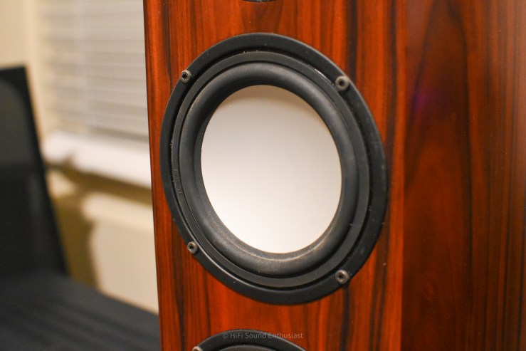 If there is anything different between the RS750 and the RS250, it’s the fact that the face width for the woofer and tweeters are noticeably different. There a more oval shape to these speakers versus the RS250, mostly because it sports smaller 5.25″ woofers than the bookshelf sister at 6.5″, and has 3 more woofers to accommodate the mid and lower frequencies. The woofers and tweeter cover pretty much the whole face of the speaker, and it brings me joy that it uses all the space on the face, without leaving much to just the emptiness of the enclosure patters. The differences are pretty much just those from what I can see. The tweeter is the same Vifa Ring Radiator tweeter as the one of the RS250, and the finish is the same, as they are from the same set. As the height of the main enclosure can be a little short for some listeners, there is a set of risers that are optional that are included as part of the speakers for review, which bring the tweeter to a height close to ear level where I’m sitting at my table, which has a table height of about 31″. As such there isn’t much of a need to tilt these speakers like the RS250s because the tweeter and the top woofer actually sit higher than the RS250 with stands. In attempting to test the enclosure the only way I can, by knocking on them, you can tell how rather dense they are, as well as how sound braced they are. They aren’t the densest I’ve tested out there, but they are quite dense for a big enclosure system.