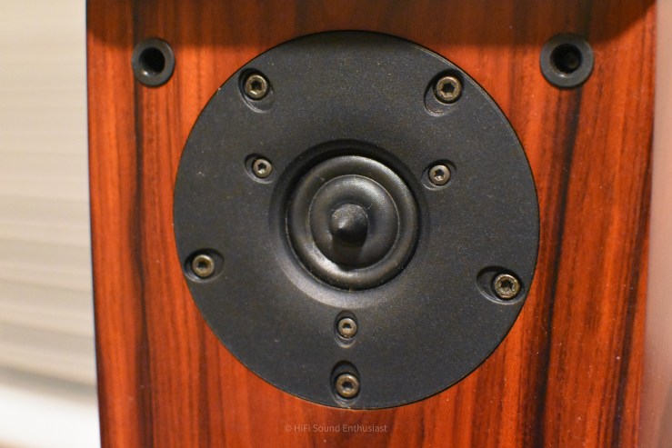 The grille is a rather long but flexible grille, which makes me think they are a little on the fragile side. However they have lasted since their initial review in 2003 (of which they have survived 2 cross-continental moves with original boxes and padding), so they are durable enough to survive with care and careful repackaging if you ever move. They are pin and cup type grilles held on by the cups that are on the speakers, 6 in total, 3 on each side on the top, middle and bottom. Looks-wise, they are actually very handsome speakers, just by the woofer and the tweeter alone. I really like the look of a fully coned woofer with no interruptions in the woofer cover unlike those with an obvious dust cover. Based on looks-wise as well, I would also like to think they are S/O friendly, since my mom found no qualms about it. They definitely don’t look like your typical speakers that sport the rectangular shape. Because of that however, these moderately weighted 56lbs speakers are actually a little harder to carry or transport, not only because of the shape, but also because of the matte finish on the Rosewood veneer.