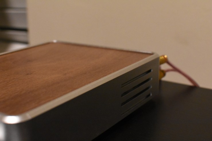 The only one of its kind in the PS Audio lineup, the Sprout100 is a very compact-sized component at 6.2in in width. It is very well designed as well as built, with an all-metal chassis and a real walnut wood top. The bottom part somewhat contrasts to the visible upper part as it appears and feels like a rather thin sheet metal with feet already attached from factory. Everything is very minimalistic about this Sprout100, but it also appears to be rather elegant with the nice sparkly finish to the metal that spans the whole side of the enclosure. It has also got a nice heft to it, weighing in at 2.9 pounds or 1.3 kilograms. This amp also runs a little warm. Never too hot that itās uncomfortable to touch, but itās noticeably hot, like a hand warmer.